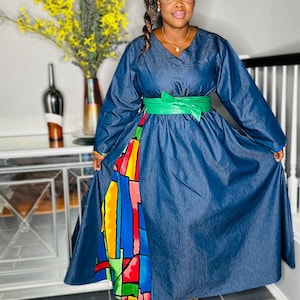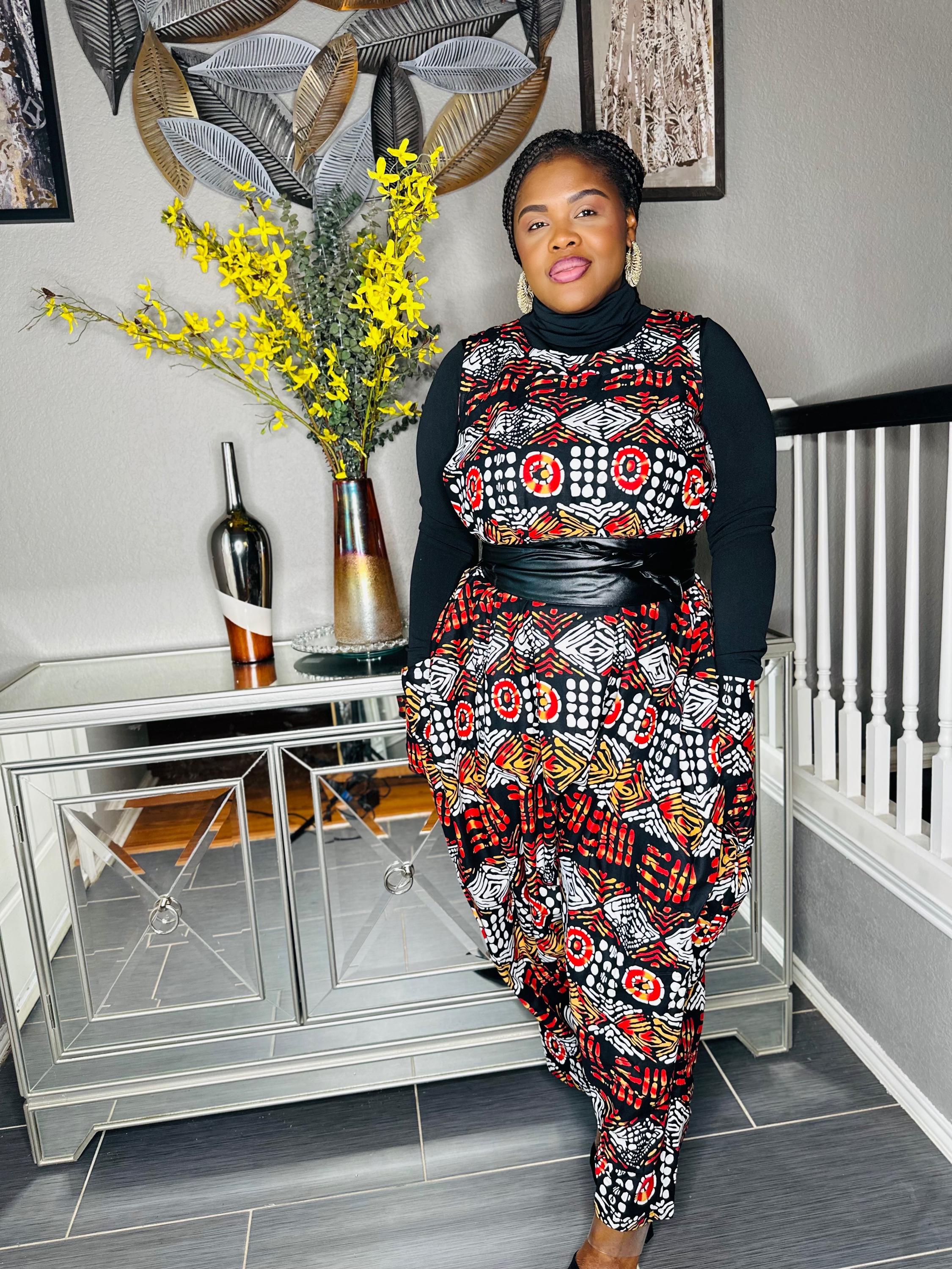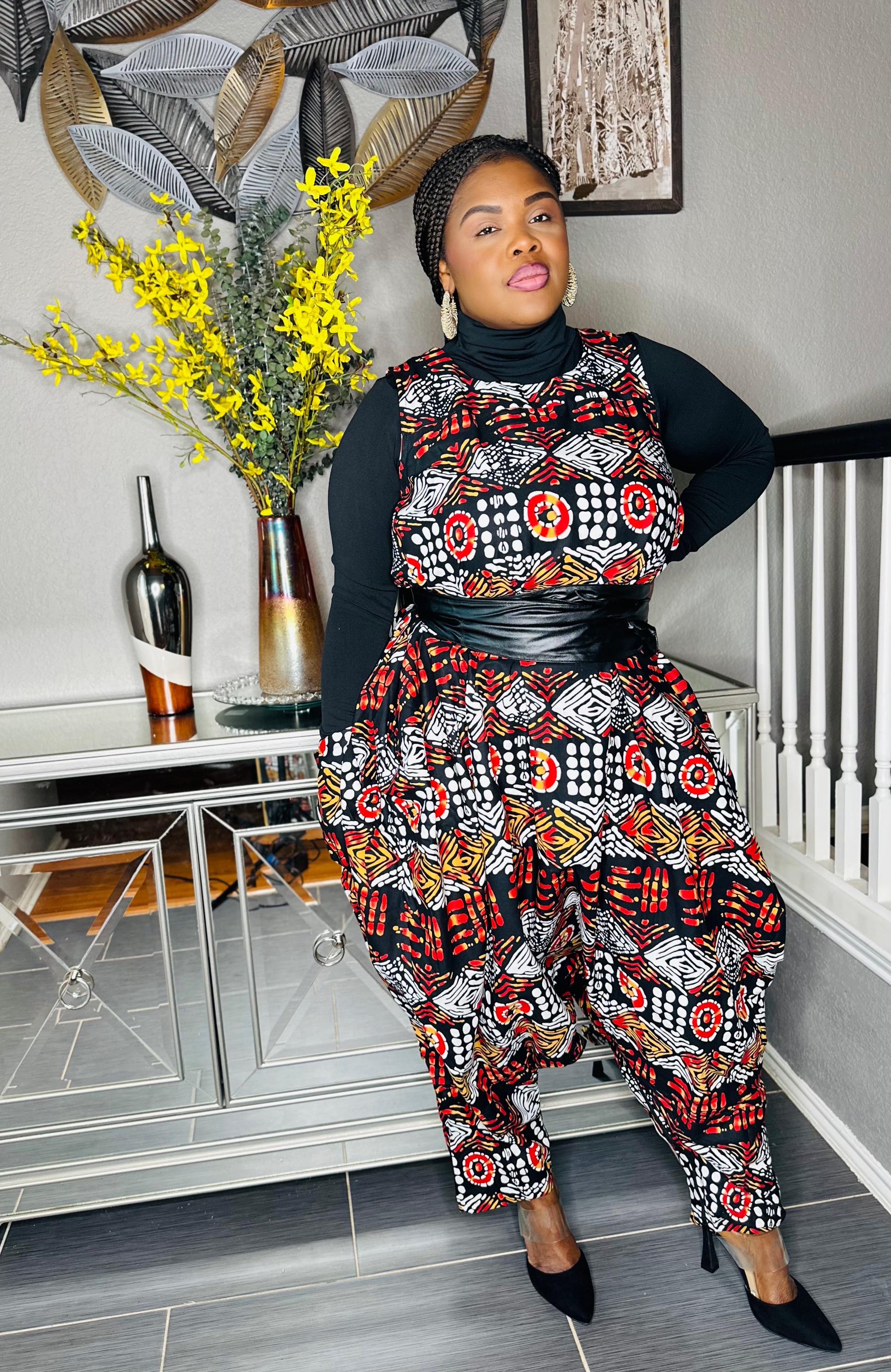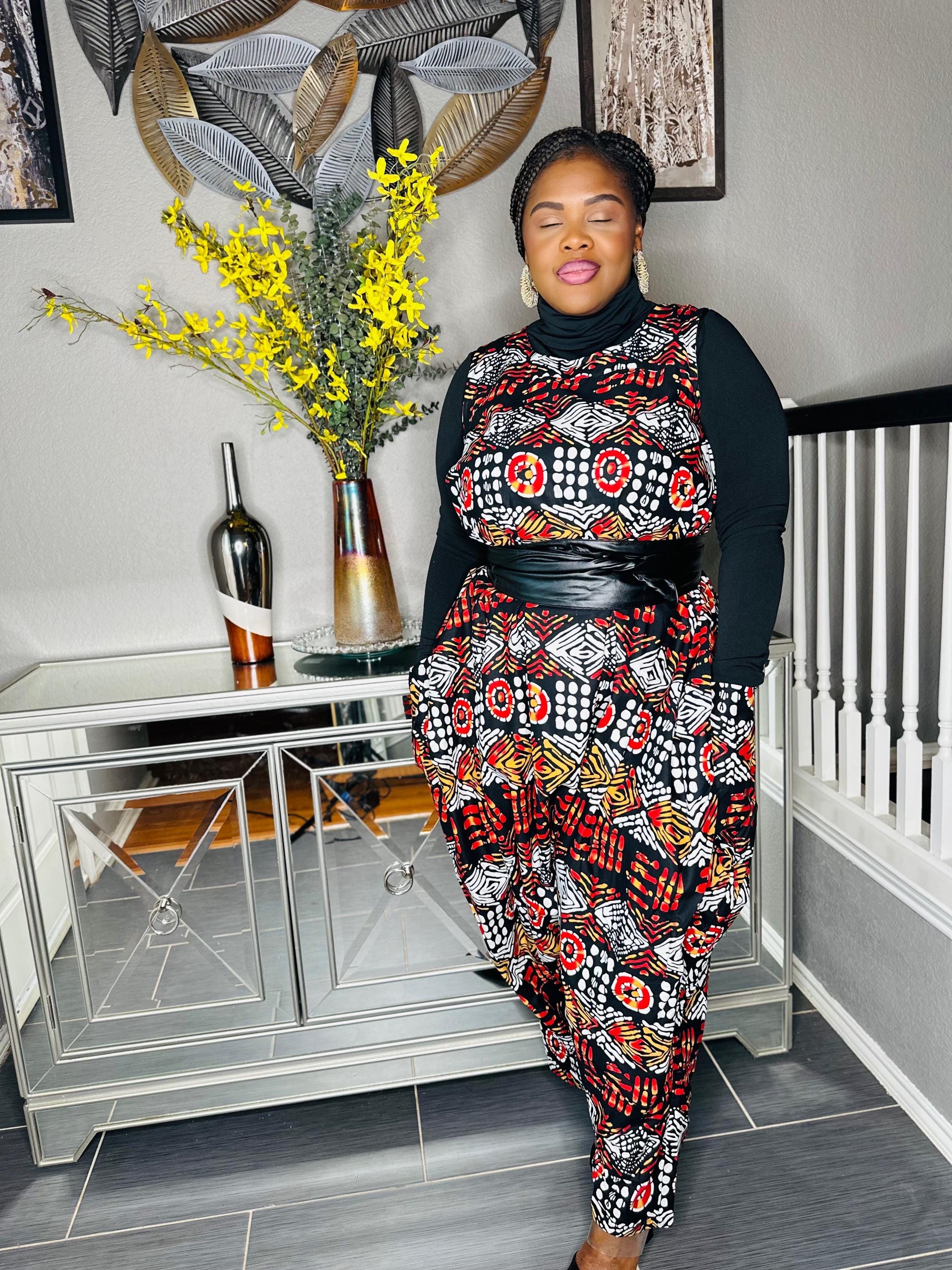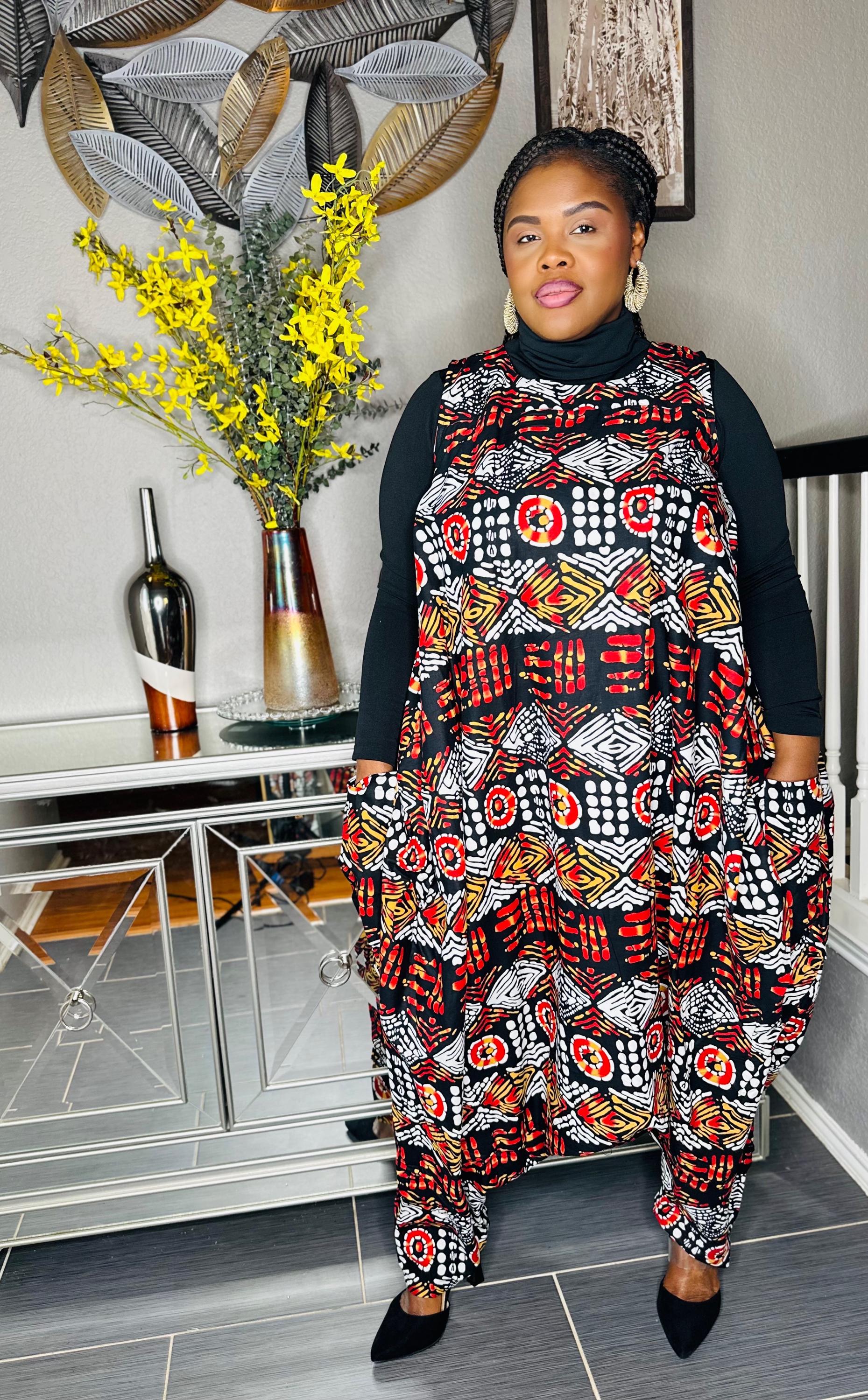 Fun African print jump suit. Fits any size up to 46" with bust. 50" waist, 54" hips, 45" length. Has 2 pockets. 100% cotton
