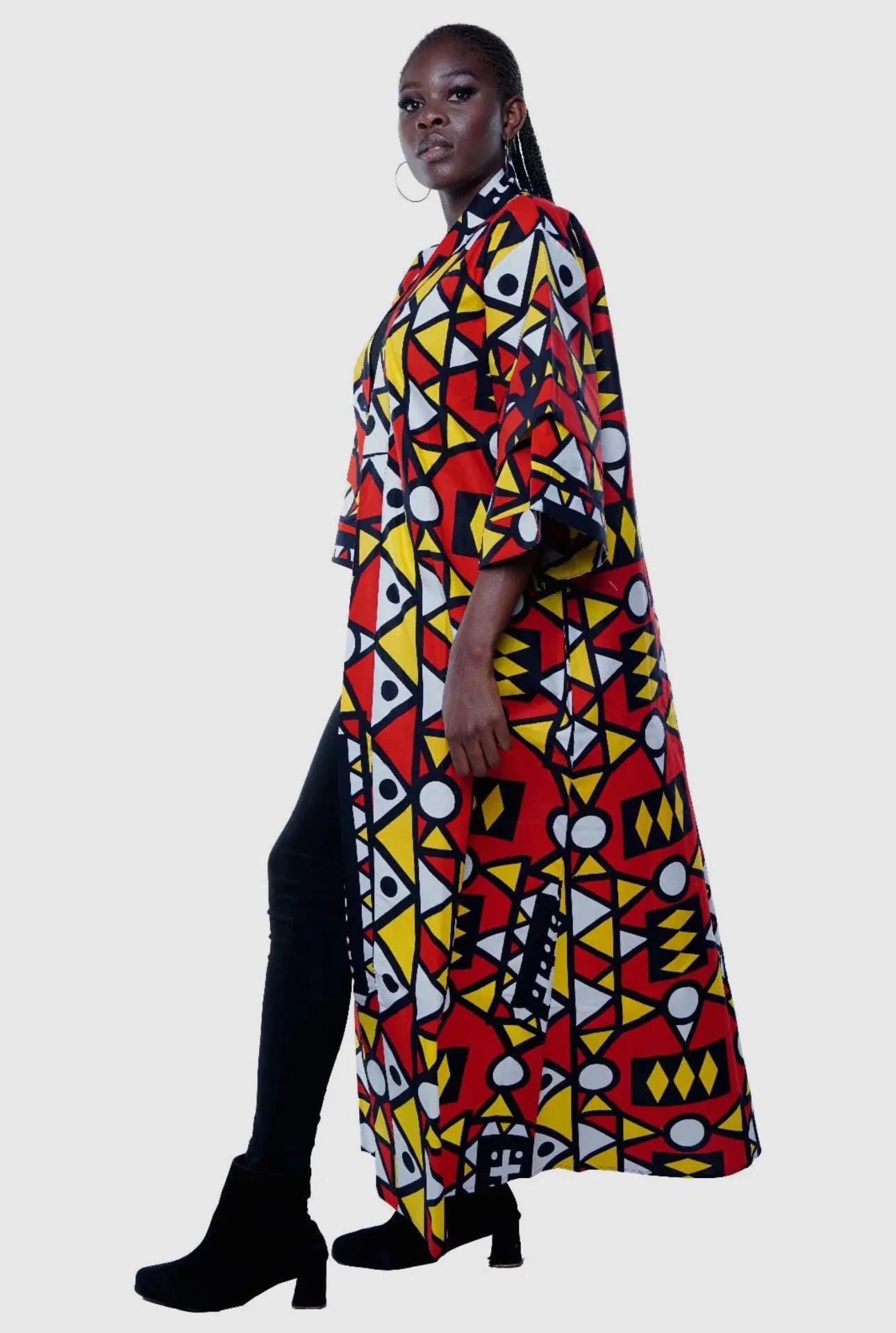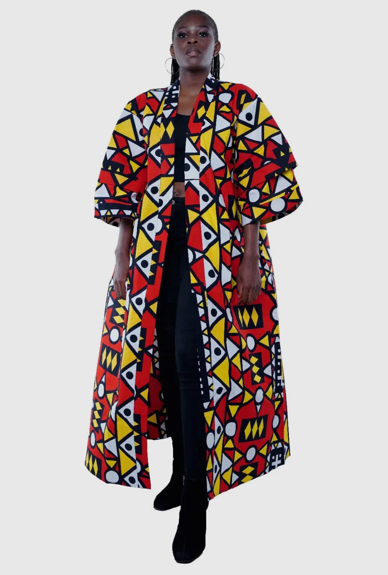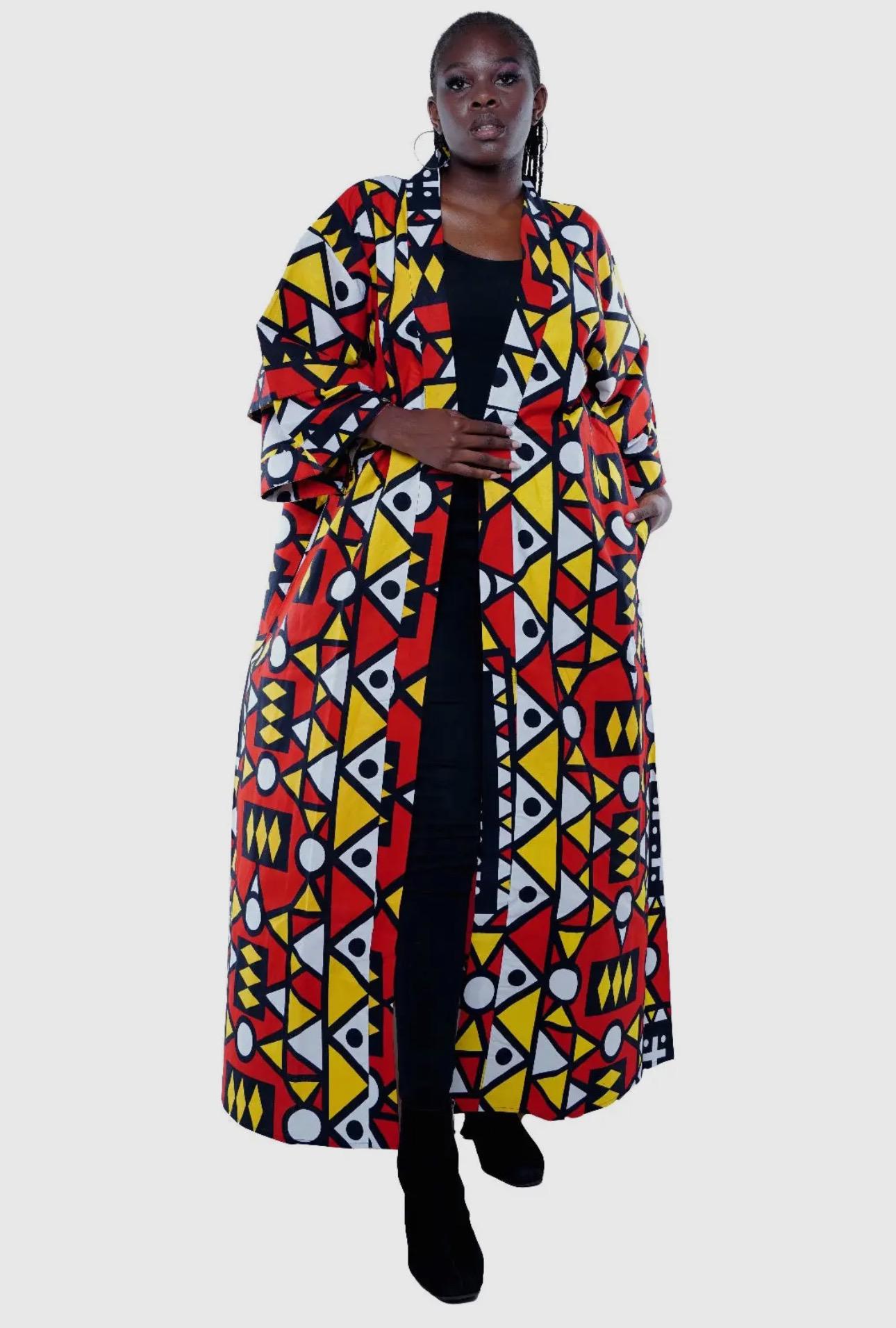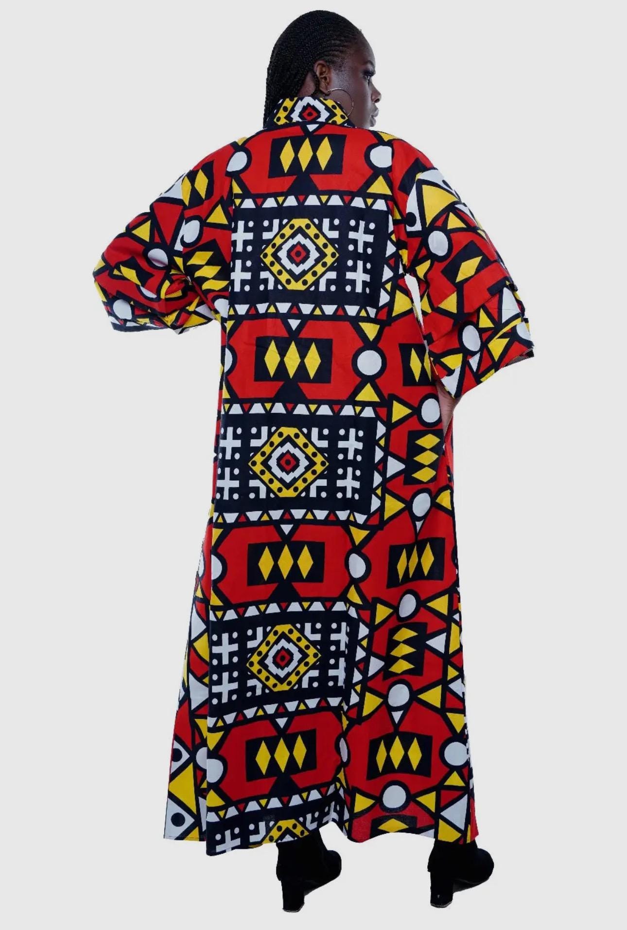 Elegant and stylish! This African Print Kimono is a vibrant addition to any wardrobe. The traditional kimono has long, loose, sleeves and tie closuret. It falls almost to the floor. 100% cotton. Measurements 58” inches in length will fit up to 60”Bust.